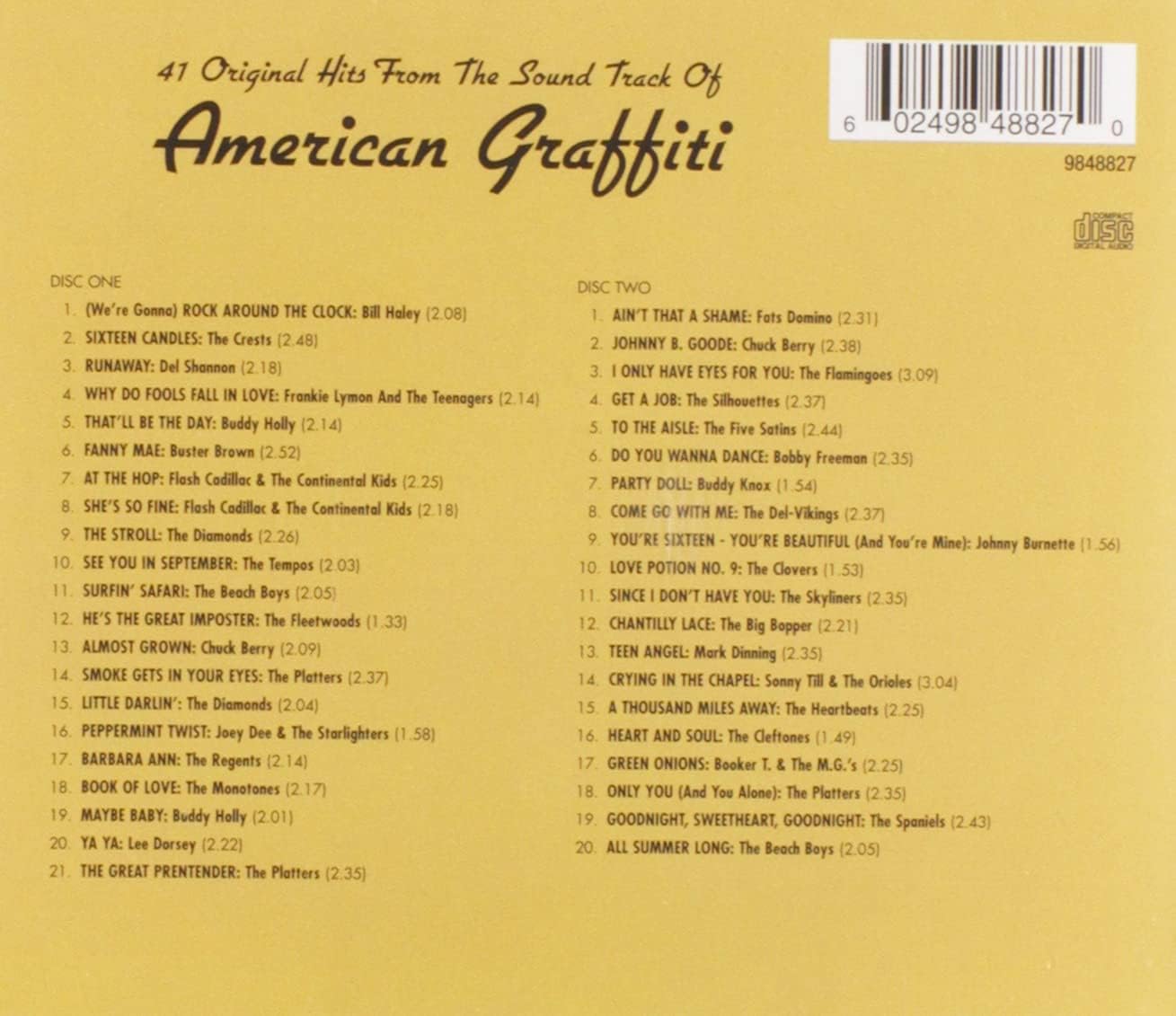 2CD set. Official 1973 original soundtrack with 41 killer tracks from the 50s & early 60s featuring Buddy Holly, Chuck Berry, Del Shannon, Platters, Flamingos, Bill Haley, Diamonds, Beach Boys & more!
