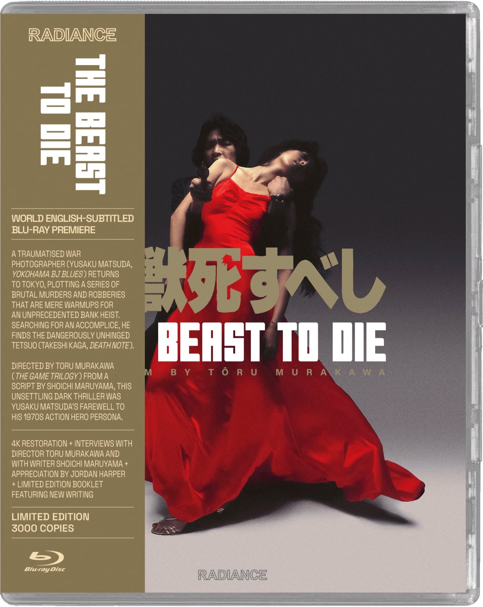 Deeply scarred by what he witnessed on battlefields across Asia, a young war photographer (Yusaku Matsuda, Yokohama BJ Blues) returns to the bustling streets of Tokyo, plotting a series of brutal murders and robberies that are mere warmups for an unprecedented bank heist. Searching for an accomplice, he finds the short-fused and equally disenfranchised Tetsuo (Takeshi Kaga, Death Note). Directed by Toru Murakawa (The Game Trilogy) from a venomous script by Shoichi Maruyama (Yokohama BJ Blues), this unsettling dark thriller was Yusaku Matsuda’s farewell to his 1970s action hero persona.