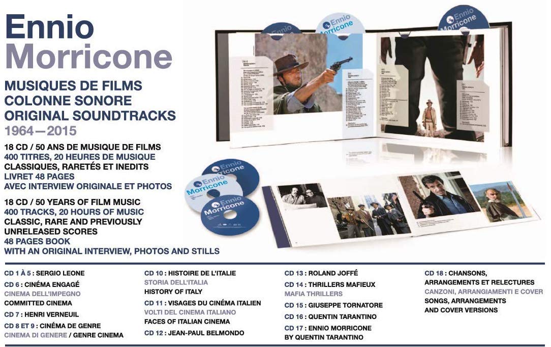 50 years of film music collected in 18 Thematic CDs, 400 tracks for over 20 hours of music. A great recording project dedicated to Ennio Morricone, made in thanks to his personal collaboration. A journey through the original versions of the unforgettable themes written for Sergio Leone, Bernardo Berolucci (1900), Henri Verneuil (The Sicilian Clan), Roland Joffe (The Mission), Brian de Palma (The Untouchables), Giuseppe Tornatore (Cinema Paradiso) and Quentin Tarantino (The Hateful Eight). It also features rarities like the music of Orca and The Key and others, plus a CD of songs and covers featuring Sting, Joan Baez, Charles Aznavour, Andrea Bocelli & Ariana Grande, Chico Buarque, Charlie Haden & Pat Metheny, Kyle Eastwood (daughter of the famous Clint), Gerard Depardieu and many others. This limited deluxe edition comes with a 48-page booklet with an exclusive interview with the Maestro, photos and original film posters.