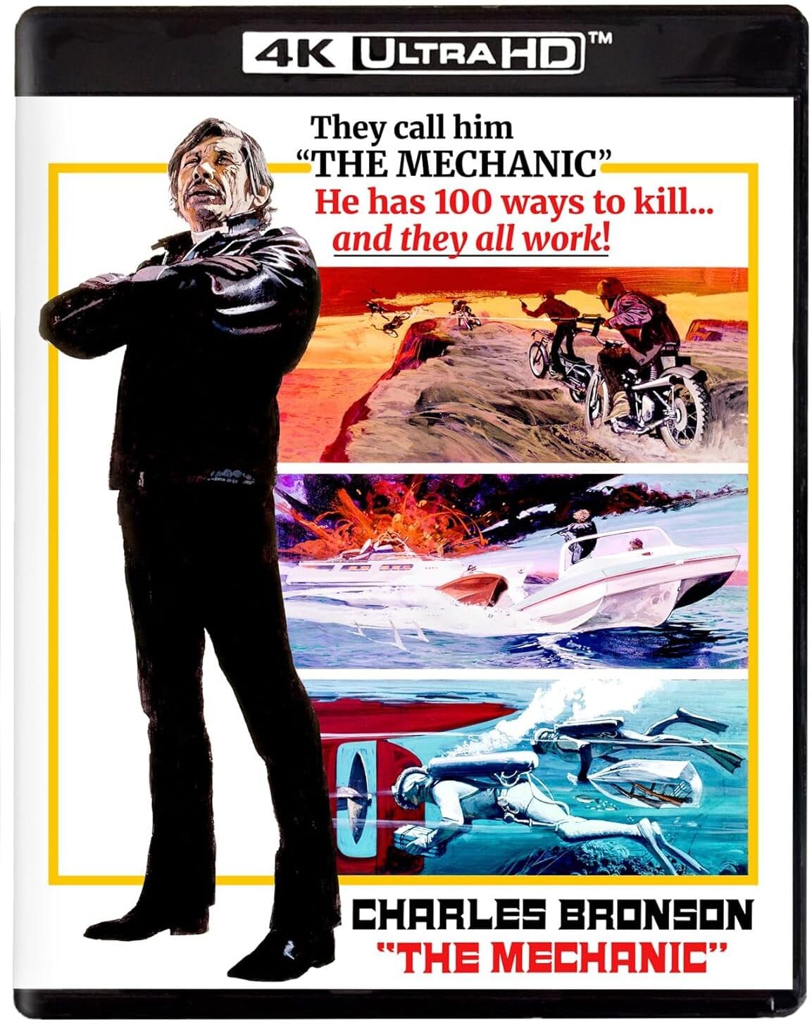 He has 100 ways to kill...and they all work! The iconic Charles Bronson (Death Wish I-V, 10 to Midnight) is at his no-nonsense best as the star of this action-drenched tale of an expert hired killer. Dignified, wealthy Arthur Bishop (Bronson) is a “Mechanic”—a professional assassin who “fixes things” for the all-powerful Organization. A man of refined tastes, his methods of engineering death are limited only by his boundless imagination. His specialty is doing every job differently, and always making his kill look like an accident. Bronson is perfect as the consummate hit-man, with his rugged, brooding self-assurance; Jan-Michael Vincent (Defiance), Keenan Wynn (Orca) and Jill Ireland (Breakheart Pass) are his marvelous co-stars. Writer Lewis John Carlino (Seconds) and director Michael Winner (Bronson gems Chato’s Land, The Stone Killer and Death Wish 1-3) pack the screen with hard-edged action, hair-raising chase sequences, exotic locales and shocking plot twists—making The Mechanic the ultimate ’70s crime thriller.