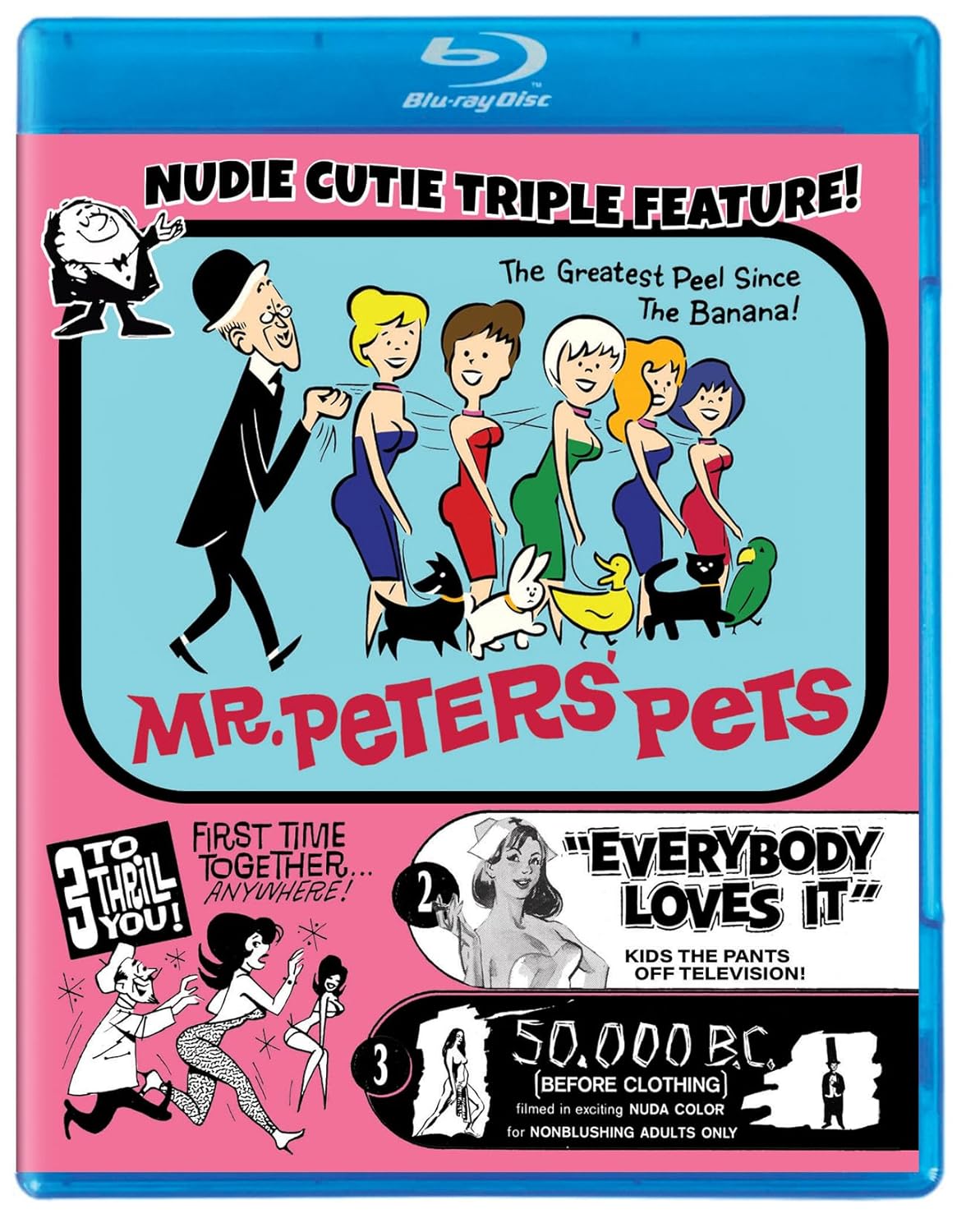 One of the silliest (and perhaps stupidest) “adults only” features of all time was Peter Perry Jr.’s Mr. Peters’ Pets, which employed the classic formula of the so-called Nudie Cutie film: the naked female form is presented in the least objectionable way, usually seen through the eyes of a harmless male goofball. Alfred Hopson stars as a pet shop owner who transforms himself into a variety of cuddly animals, thereby gaining entry into the boudoirs of his shapely female clients. Also featured in this collection are two bonus films mastered from vintage 35mm prints: the time travel fantasy 50,000 B.C. and the MAD Magazine-style TV parody Everybody Loves It, narrated (believe it or not) by a four-leaf clover. Filled with cringe-inducing comedy and devoid of genuine eroticism, the Nudie Cutie was a short-lived phenomenon, but has become a beloved relic of the collapse of Hollywood censorship.