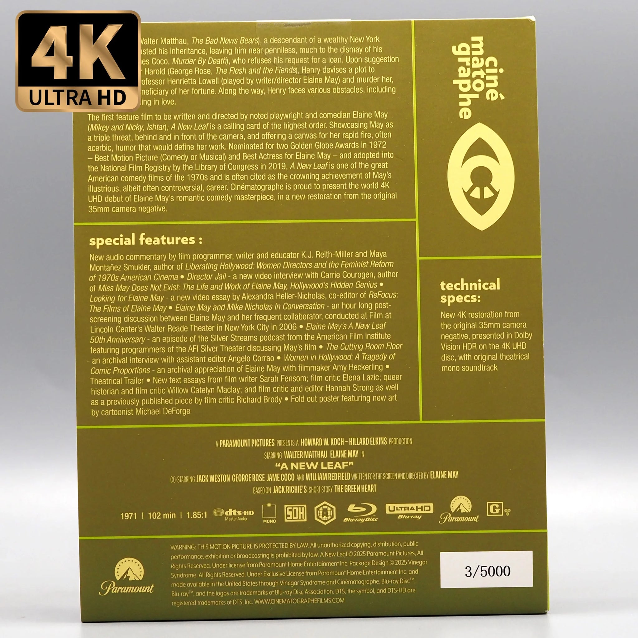The first feature film to be written and directed by noted playwright and comedian Elaine May (Mikey and Nicky, Ishtar), A NEW LEAF is a calling card of the highest order. Showcasing May as a triple threat, behind and in front of the camera, and offering a canvas for her rapid fire, often acerbic, humor that would define her work. Nominated for two Golden Globe Awards in 1972 – Best Motion Picture (Comedy or Musical) and Best Actress for Elaine May – and adopted into the National Film Registry by the Library of Congress in 2019, A NEW LEAF is one of the great American comedy films of the 1970s and is often cited as the crowning achievement of May’s illustrious, albeit often controversial, career. Cinématographe is proud to present the world 4K UHD debut of Elaine May’s romantic comedy masterpiece, in a new restoration from the original 35mm camera negative.