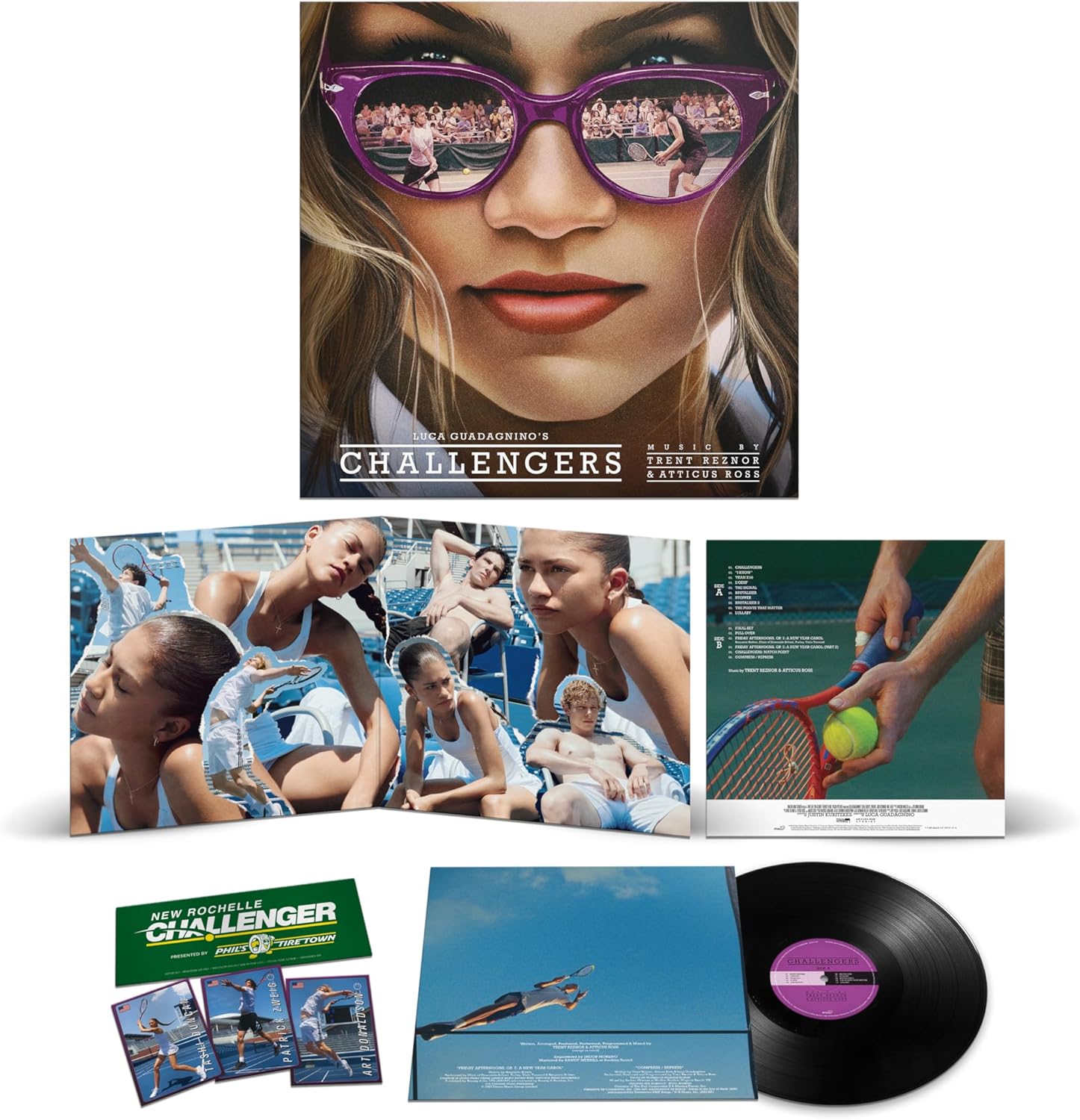 Limited 180gm vinyl LP pressing housed in gatefold jacket. Includes trading cards and bumper sticker. Academy Award-winning composers Trent Reznor & Atticus Ross deliver a propulsive, hard-hitting original score to the high-stakes world of professional tennis for Luca Guadagnino's acclaimed 2024 film CHALLENGERS starring Zendaya, Mike Faist and Josh O'Connor. The deluxe gatefold release features vinyl-exclusive extras alongside the 16-track original score pressed on 180 gram black audiophile vinyl. Including fan favorite score moments "Challengers: Match Point", "Yeah x10" and the original end credits song "Compress / Repress" co-written with Luca Guadagnino and performed by Trent Reznor & Mariqueen Maandig Reznor. ?Included in the package is a custom interior gatefold collage featuring on-set photos by photographer Alessio Bolzoni, a collectible set of three player trading cards featuring Zendaya, Josh O'Connor and Mike Faist as Tashi, Patrick and Art, as well as an exclusive Phil's Tire Town bumper sticker.