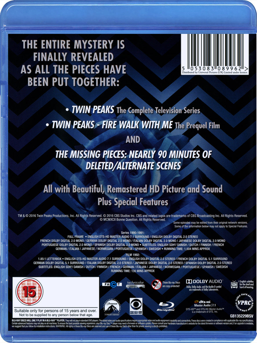 Includes: The Original 90s Series. The prequel film Twin Peaks: Fire Walk With Me and The Missing Pieces, nearly 90 minutes of never-before-released deleted or alternated scenes (Missing Pieces is also available in the Criterion Twin Peaks: Fire Walk With Me Blu-Ray).